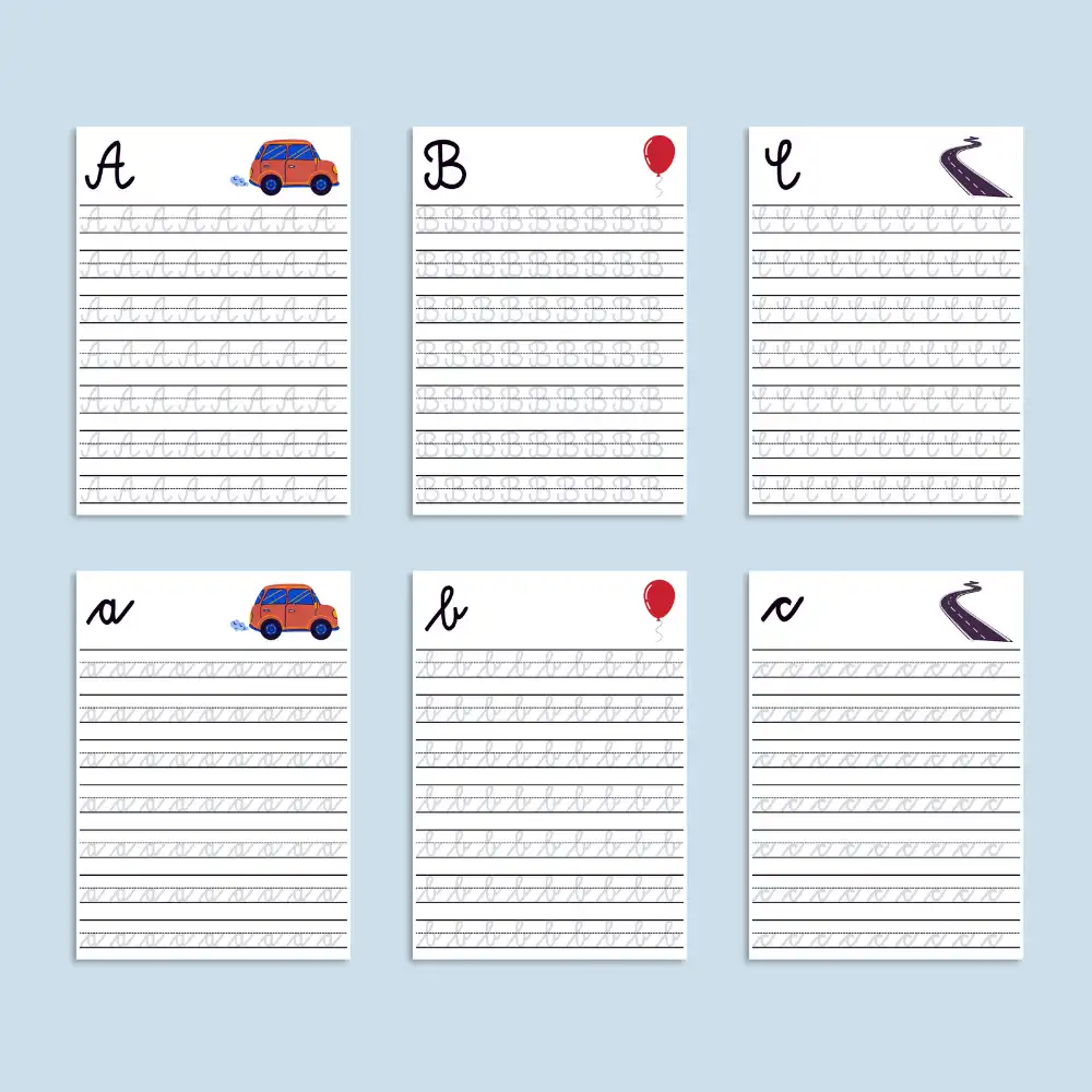 Paket vsebuje več kot delovnih 150 listov z nalogami in aktivnostmi, ki vsebujejo vaje za učenje pisanih črk. Otroci se bodo naučili velike in male pisane črke.