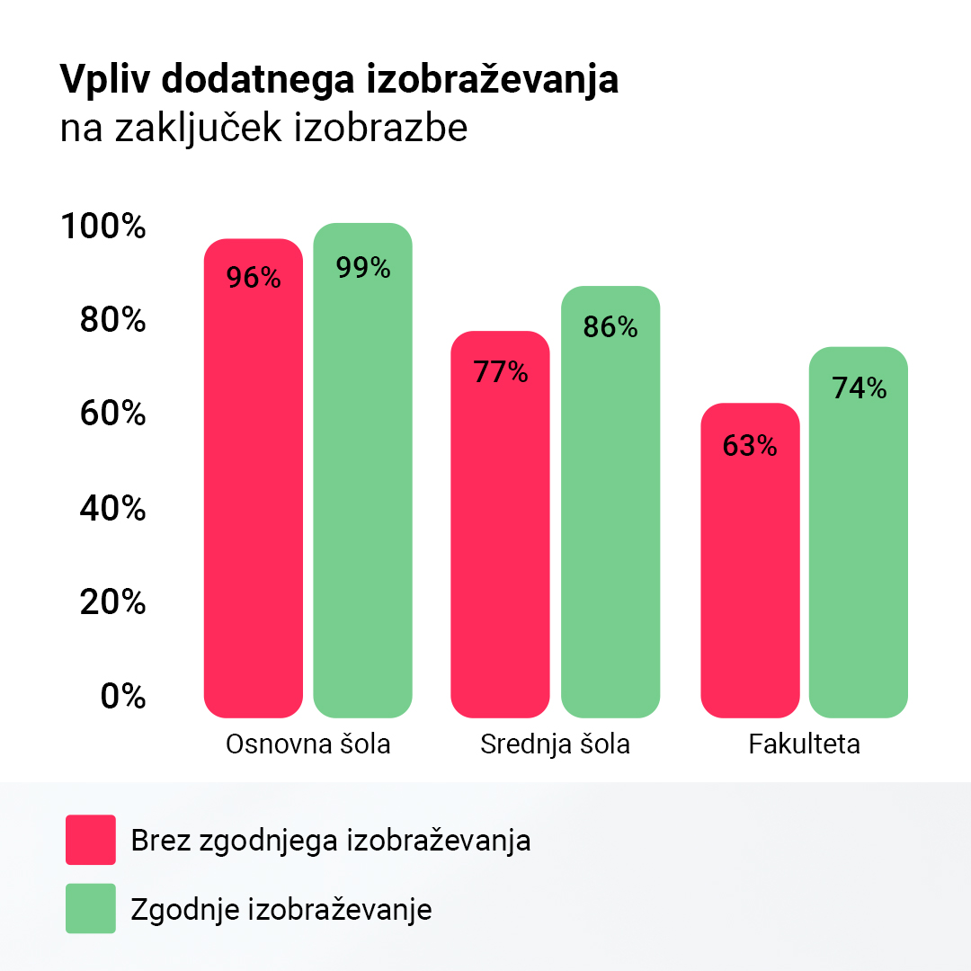 Analiza, izvedena na podlagi 22 študij med letom 1960 in 2006, prikazuje odstotek dokončanja izobrazbe z in brez dodatnega izobraževanja v mladosti.