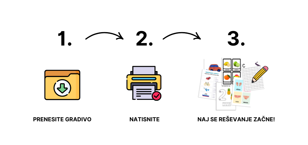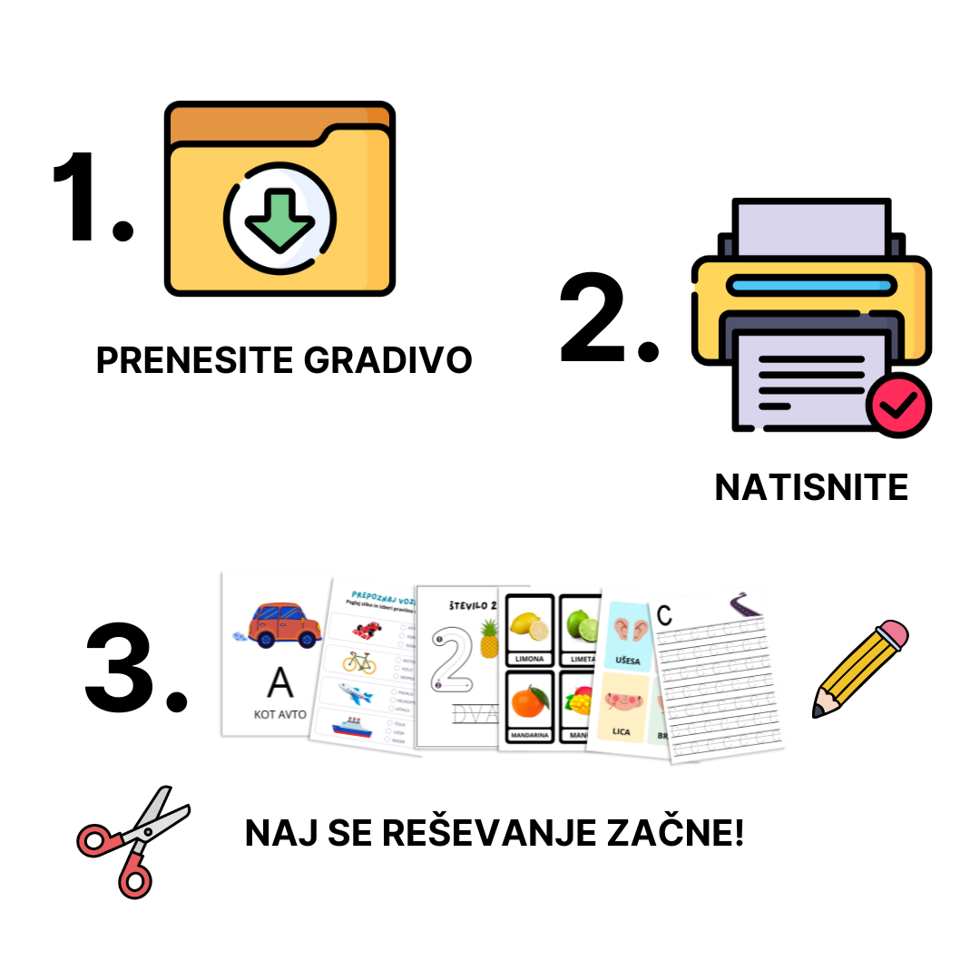 Gradivo prejmete v PDF-datotekah, ki jih natisnete, in vaš otrok je že pripravljen za reševanje nalog. Otroci naloge rešujejo skozi igro, kar spodbuja njihovo kreativnost, pismenost in kognitivni razvoj.