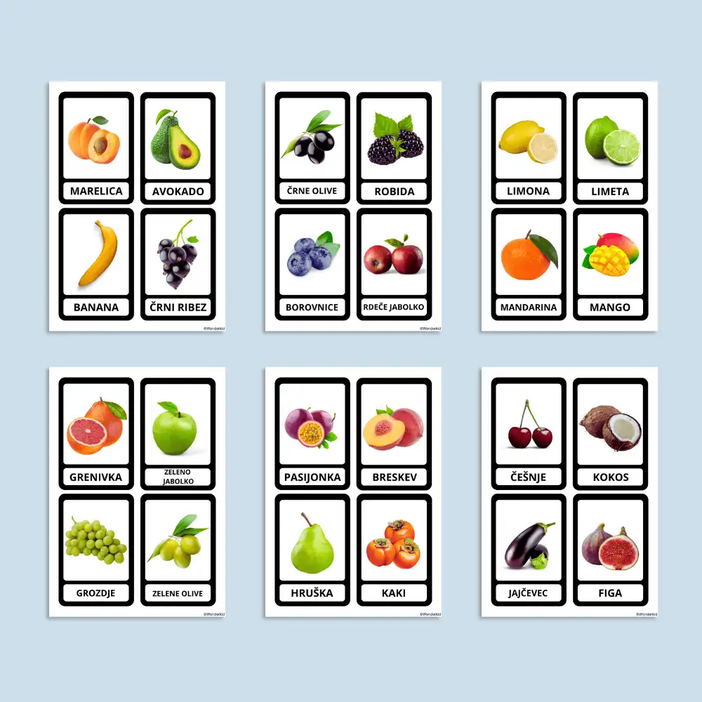Paket vsebuje delovnih 40 listov z nalogami in aktivnostmi. Otroci se bodo naučili različnih vrst sadja in zelenjave. Naučili se jih bodo prepoznati in poimenovati.