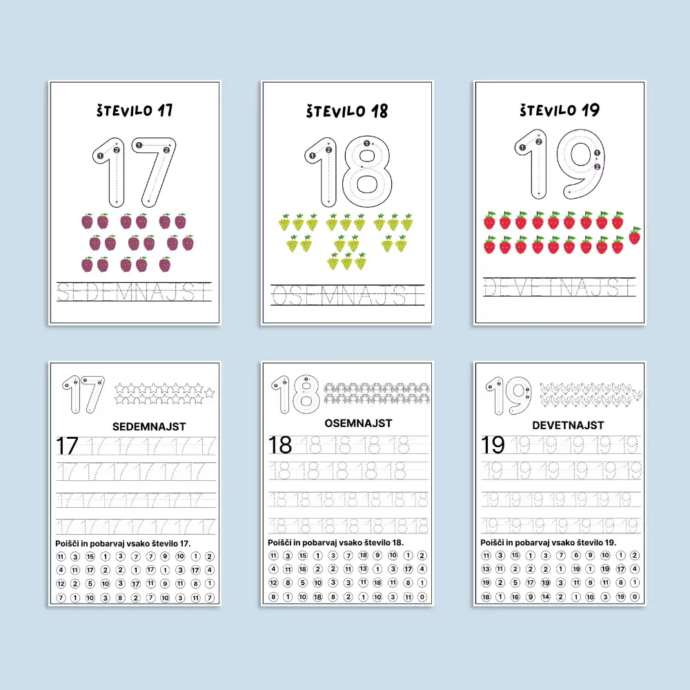 Paket vsebuje več kot delovnih 160 listov z nalogami in aktivnostmi. Otroci se bodo naučili števil od 0 do 20. Naučili se bodo šteti, prepoznati in zapisati števila, ter mnoge druge veščine.